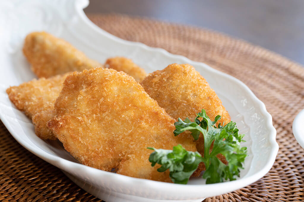 鶏むね肉に、ほのかなハーブスパイスをきかせてフライしています。