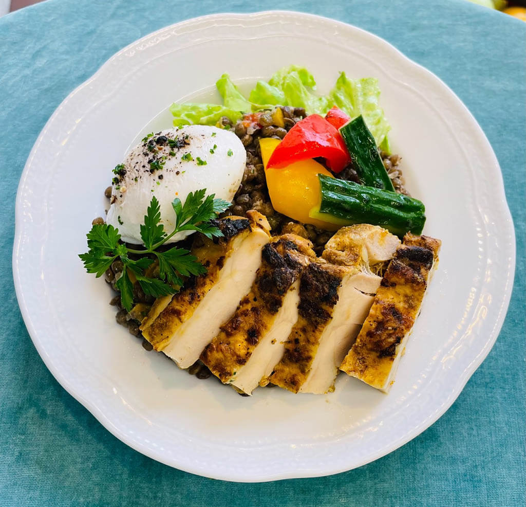自家製赤ワインヴィネガーのドレッシングで味付けしたレンズ豆にオリエンタルチキン、ポーチドエッグを盛り込んだ、ボリュームと栄養たっぷりのディナーサラダ。